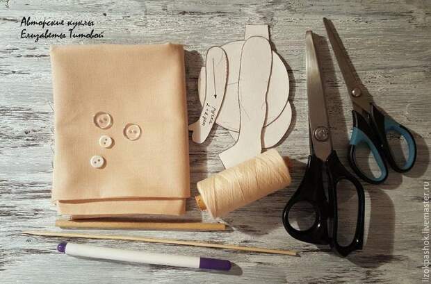 Ткань для тела куклы (я использую корейский хлопок), выкройка, ножницы простые и зиг-заг (не обязательно), нитки в тон ткани, крепкие нитки для пришивания ножек и ручек, две пуговицы диаметром 1,5см, две пуговицы диаметром 1 см, палочка для набивки, бамбуковая шпажка, исчезающий маркер или простой карандаш, наполнитель для игрушек (у меня холлофайбер), швейная машина.